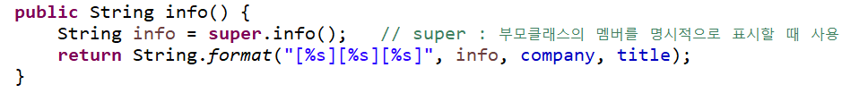 " super.info( ); "를 사용하면 된다. String info = super.info(); 를 아래와 같이 사용 하면 된다.