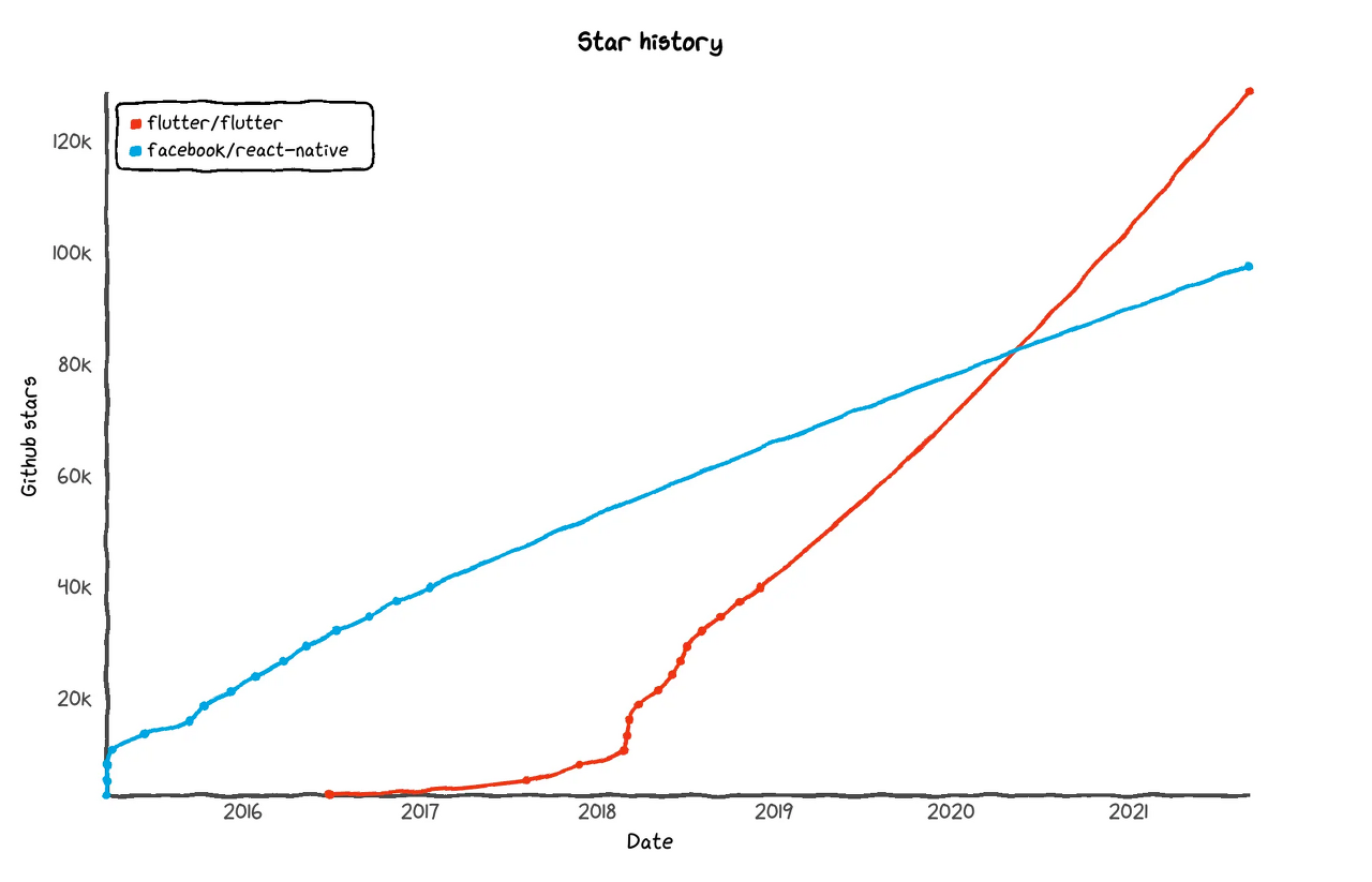 빨간색 그래프로 보여지는 플러터의 활용가능성이 리액트의 상승 폭보다 훨씬 높다.