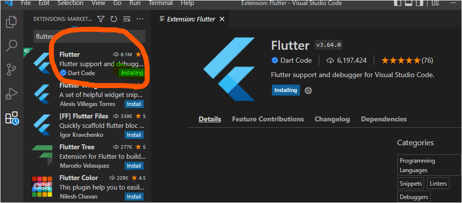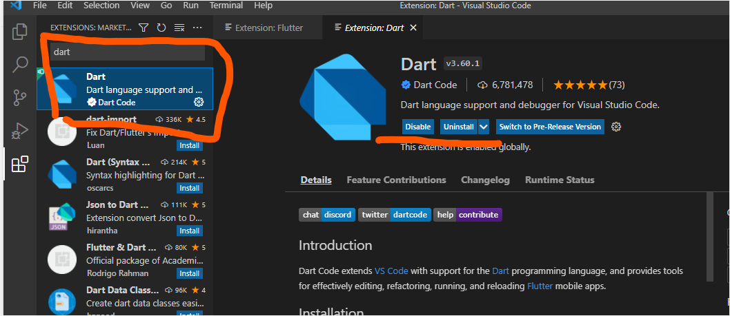 dart라고 검색하면, 우측화면에 Disable 과 Uninstall 이 있어서 설치가 되어있음이 확인된다.