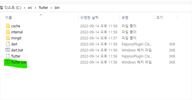 flutter.bat 라는 실행 파일이 있음을 확인할 수 있다.