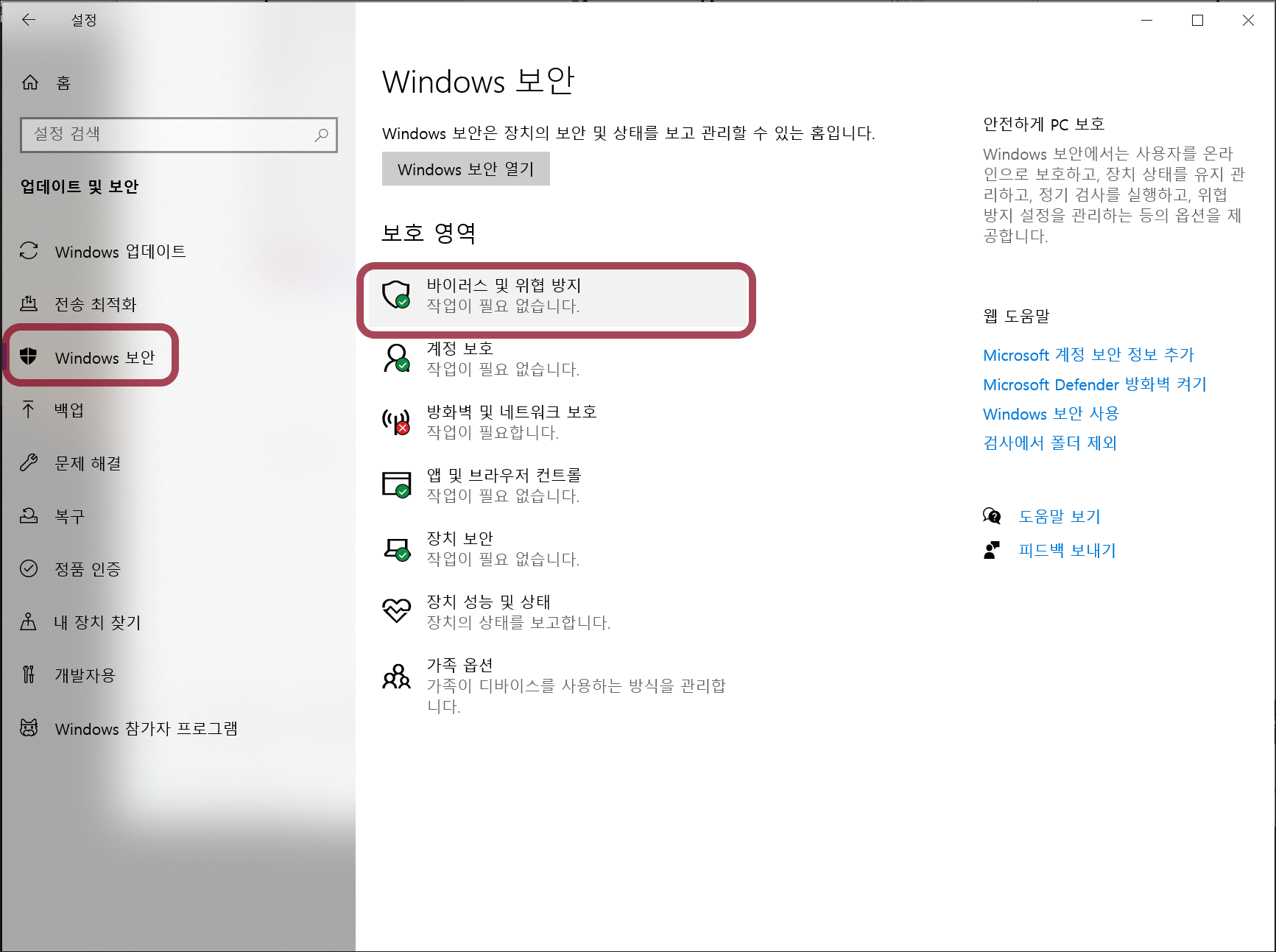[Windows 보안] → 바이러스 및 위협 방지 → 바이러스 및 위협 방지 설정 에서 설정관리