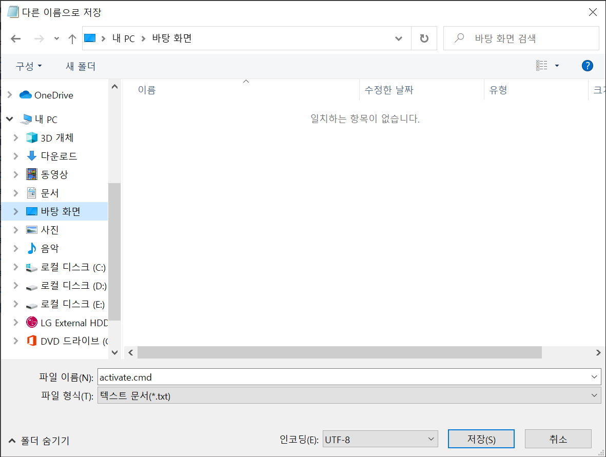 그리고 해당 TXT 파일을 열고 activate.cmd 라고 파일으름을 수정한 후 바탕화면에 저장한다